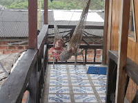 Notre chargement et le temps limité dont ont dispose nous oblige à faire des choix pour notre parcours. Après les Baleines, sur la côte on suit l'avis des nos guides touristiques et on se rend dans la station réputée animée de Bahia de Caraquez. Effectivement il y a de l'ambiance mais c'est celle de Berck-sur-Mer hors saison. On tourne en rond et on finit par trouver la plage. On retourne dans l’hôtel miteux que nous n'avions pas eu le courage de dédaigner après le trajet long et éprouvant. On prépare le traditionnel apéro-dessins-animés et là ...c'est le drame! Plus d'ordinateur. Après une enquête expéditive digne de Columbo et Scoobidou réunis, on découvre le pot aux roses. Sachant que l'ordinateur était dans sa sacoche dés le matin, que la dite sacoche se situait dans le sac à dos, que Séverine n'a pas quitté le sac à dos de la journée avant de le laisser à l'hôtel, que seul le gérant de l'hotel disposait de la clé, le coupable est....le gérant qui s'est justement absenté. S'en suit, une descente de police (à quatre agents en 4X4), la déposition de Corentin au poste (dans la ligne de mire de l'arme de service négligemment posée sur le bureau de l'inspecteur Harry), et notre fuite dans un hôtel plus confortable et plus sur. Chouette, on pourra raconter que nous avons connu l'insécurité en Amérique du Sud et qu'on a même tremblé (de froid).